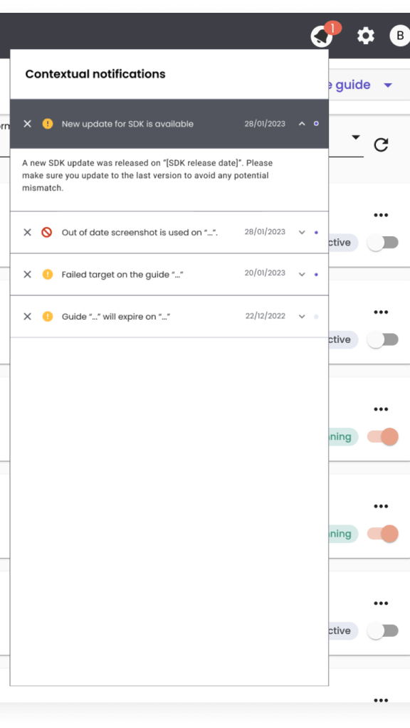 Surface: Prioritised, Pop-up, mostly no action required. In case there’s an action required there should be a dismiss icon available.
